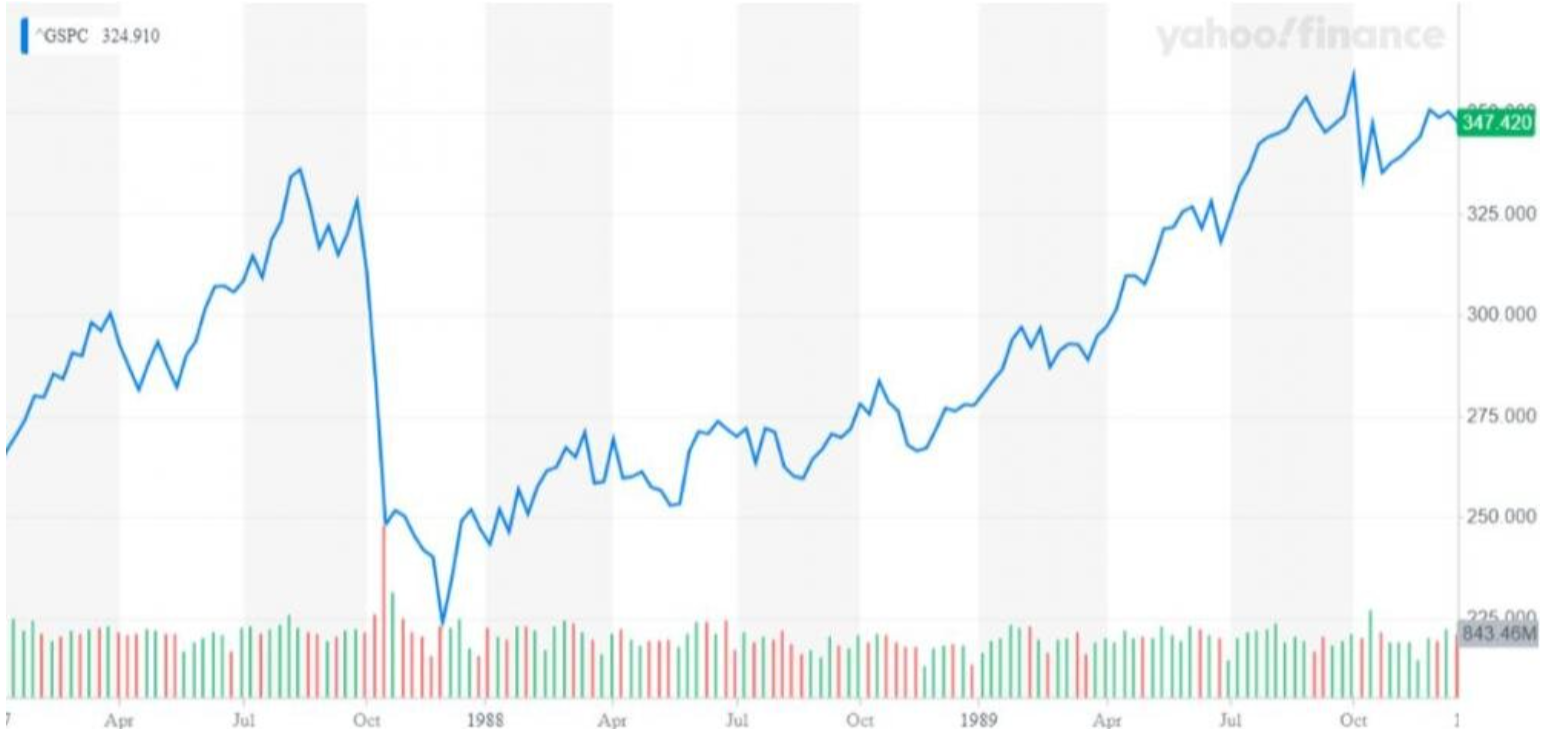The largest one-day drop in the markets occurred on October 19, 1987, a day commonly referred to as Black Monday. Interestingly, that drop occurred during a secular bull market, which also defines the current state of the market. While the facts, circumstances and hopefully magnitude of that decline are different than the current decline, a couple charts may be helpful to provide some additional perspective.