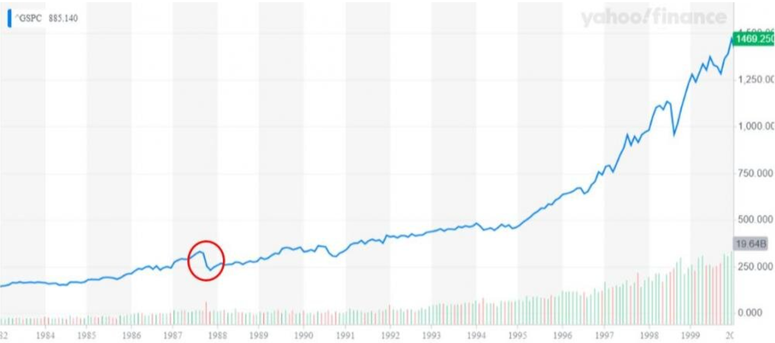 This next chart shows the events of October 1989 in the context of the longer-term. The circle shows the Black Monday decline.