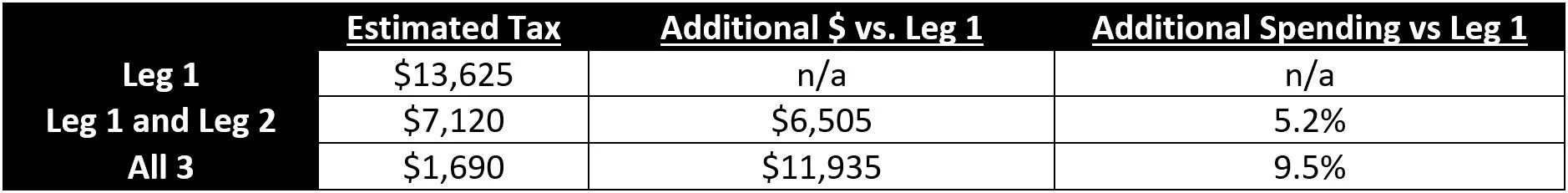 Leg 1 only: In this case, the full $125,000 would be taxed. After accounting for deductions, the actual taxes due would be around $13,625.