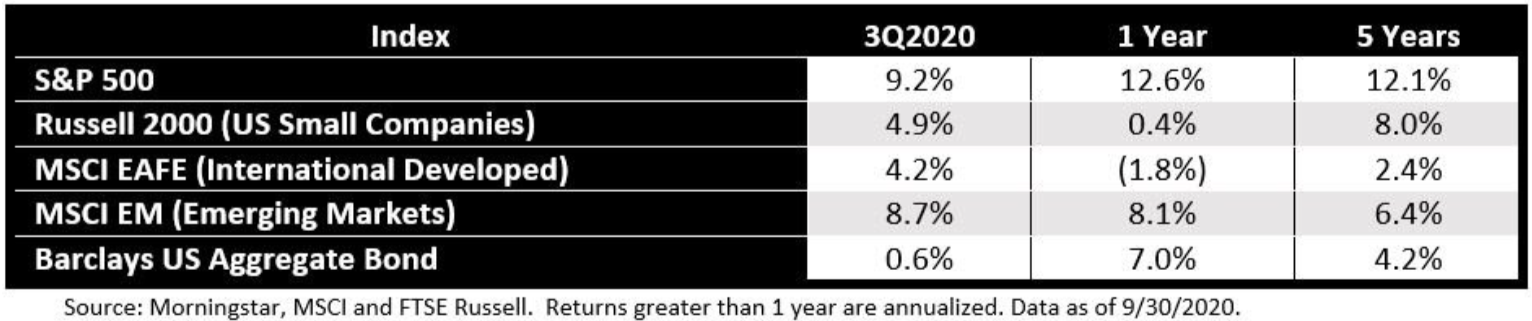 The following chart reflects the performance of a variety of indexes during the last quarter and for longer periods as well.